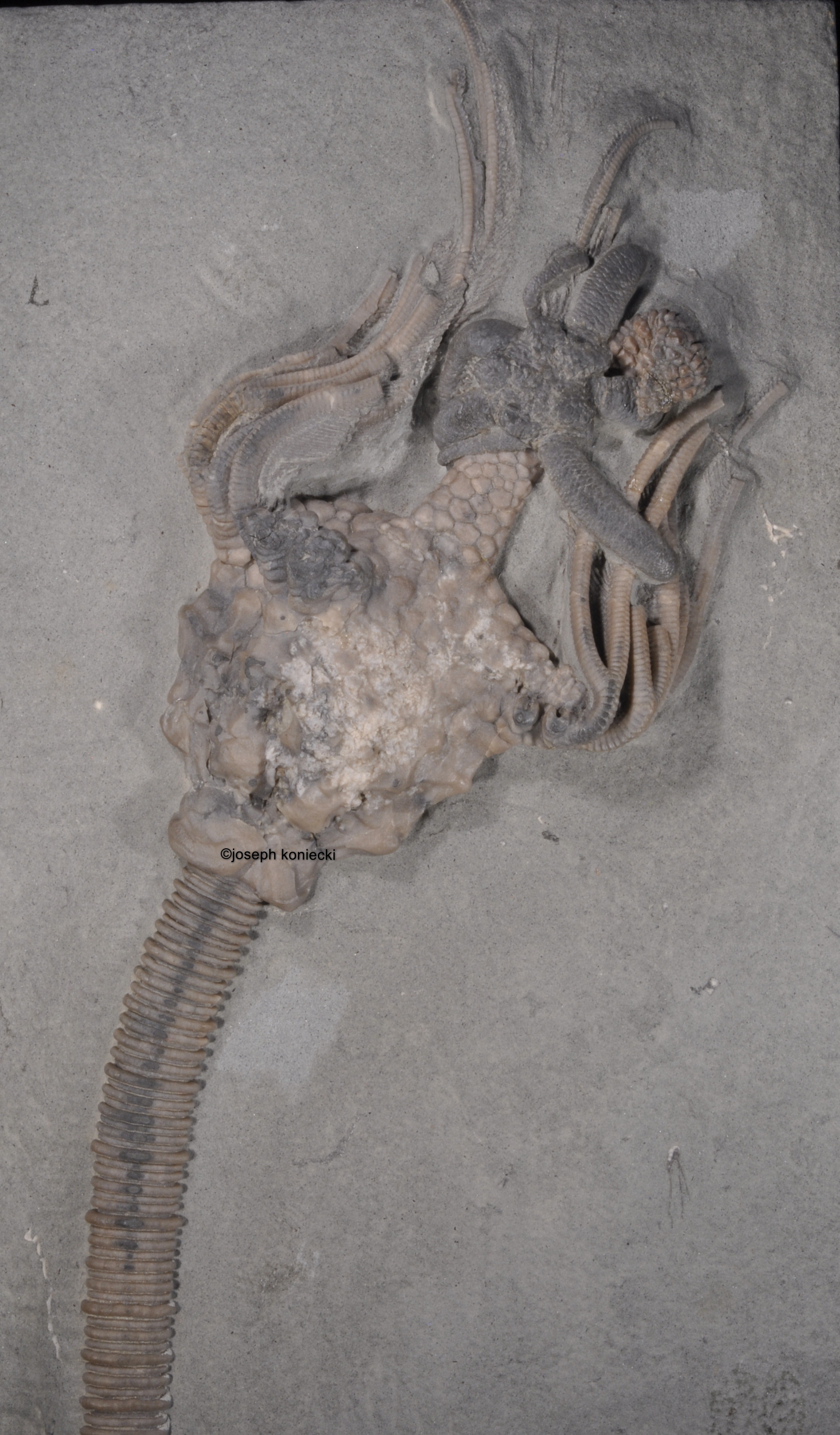 This piece shows a brittle star wrapped around the tegmen of the crinoid.