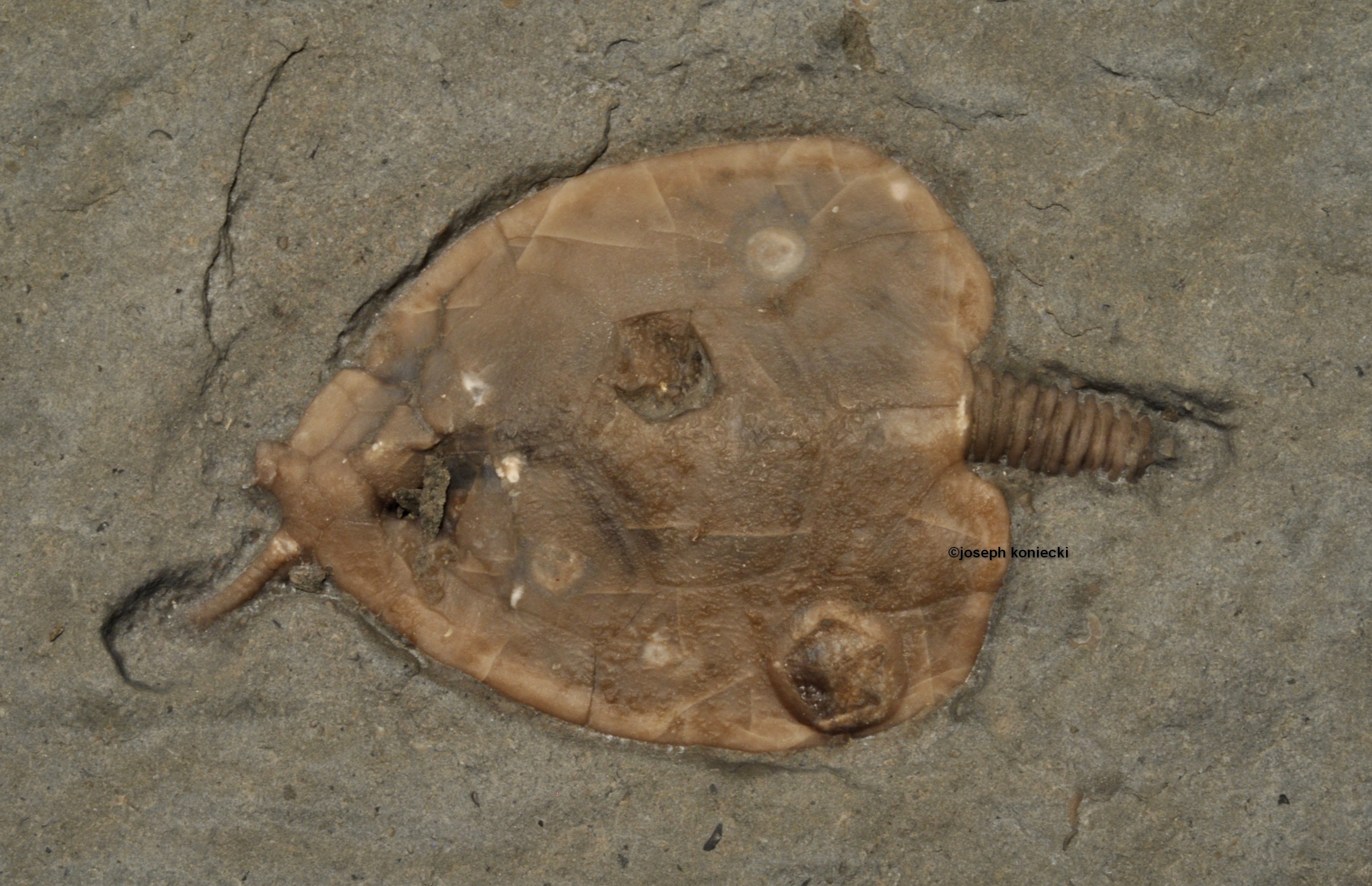 This specimen has a edrioasteroid growing on it.