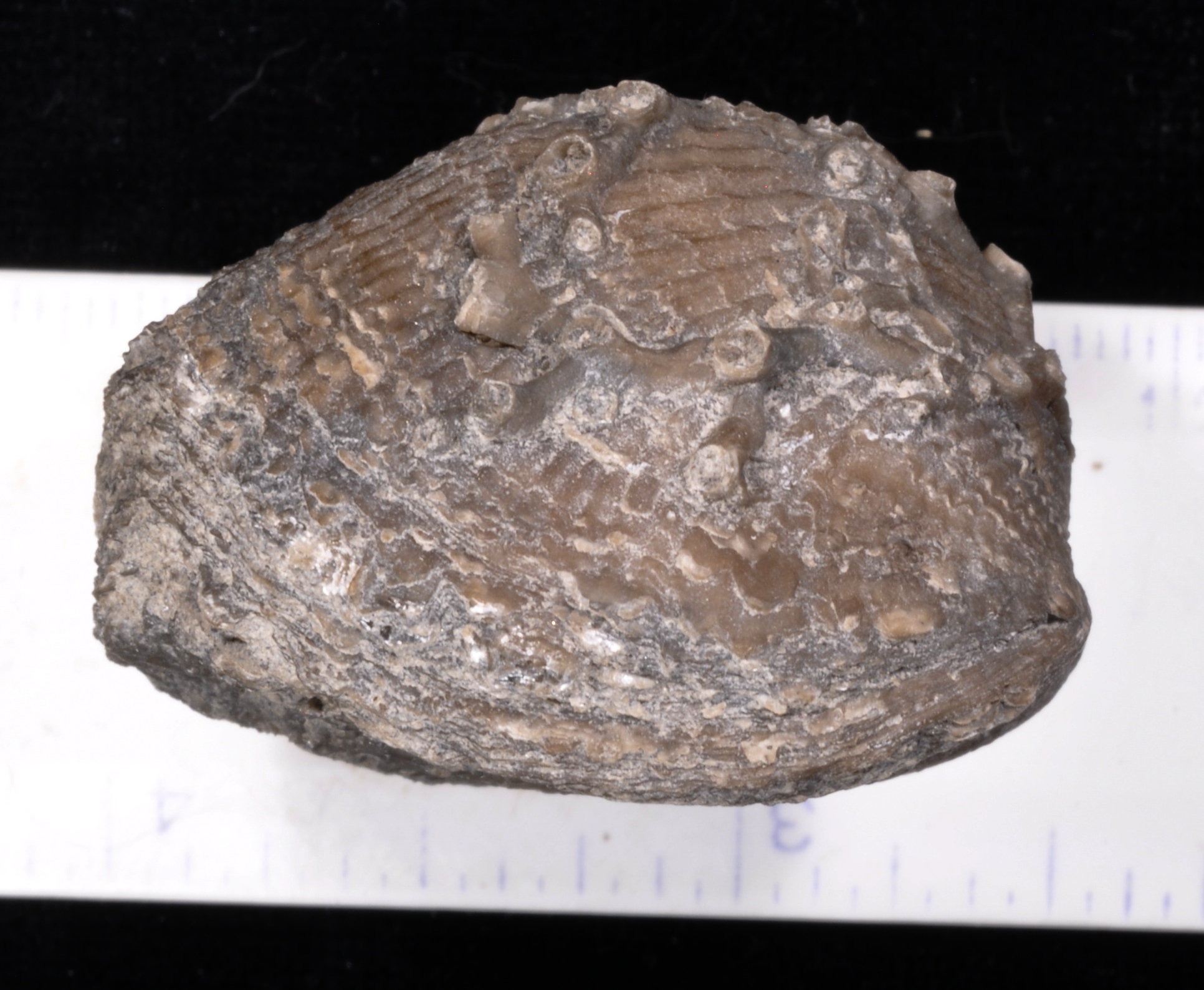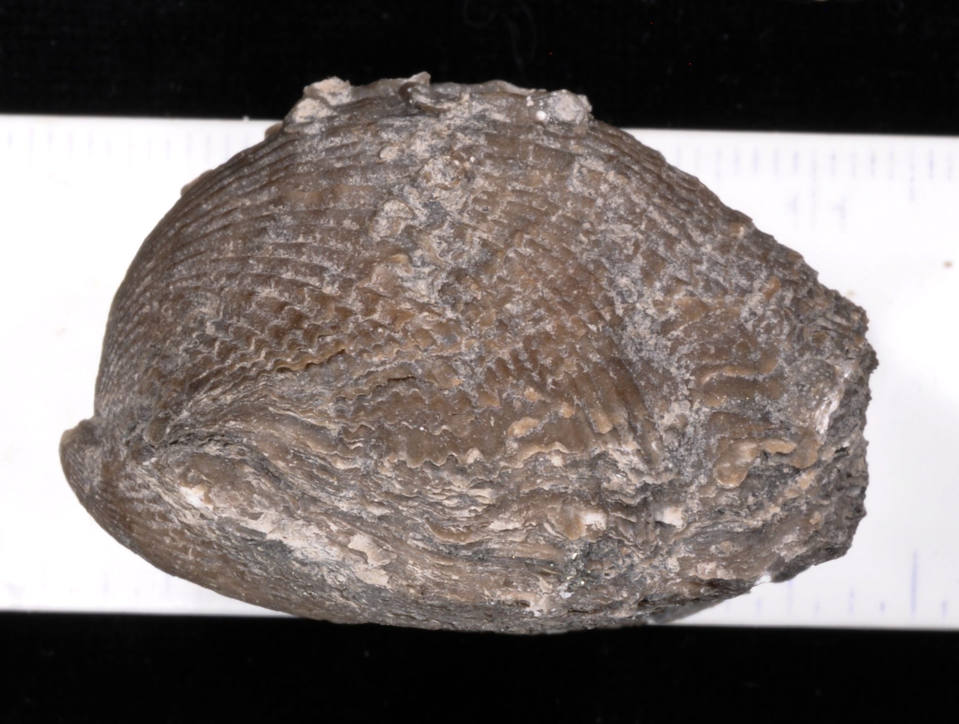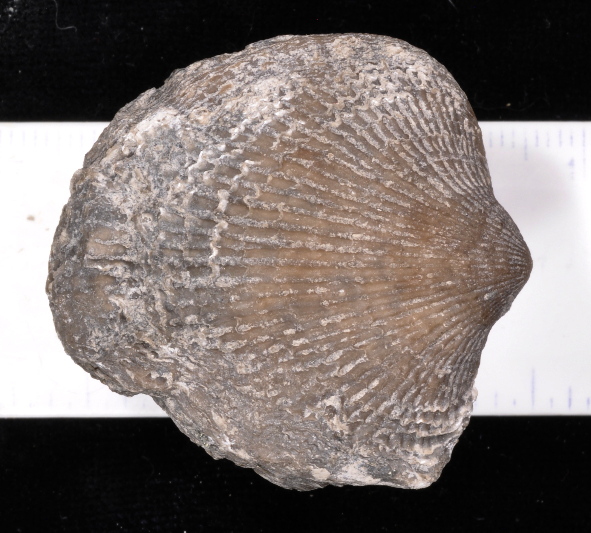 The brachiopod is about 3.5 X 3.8 X 2.7 cm.