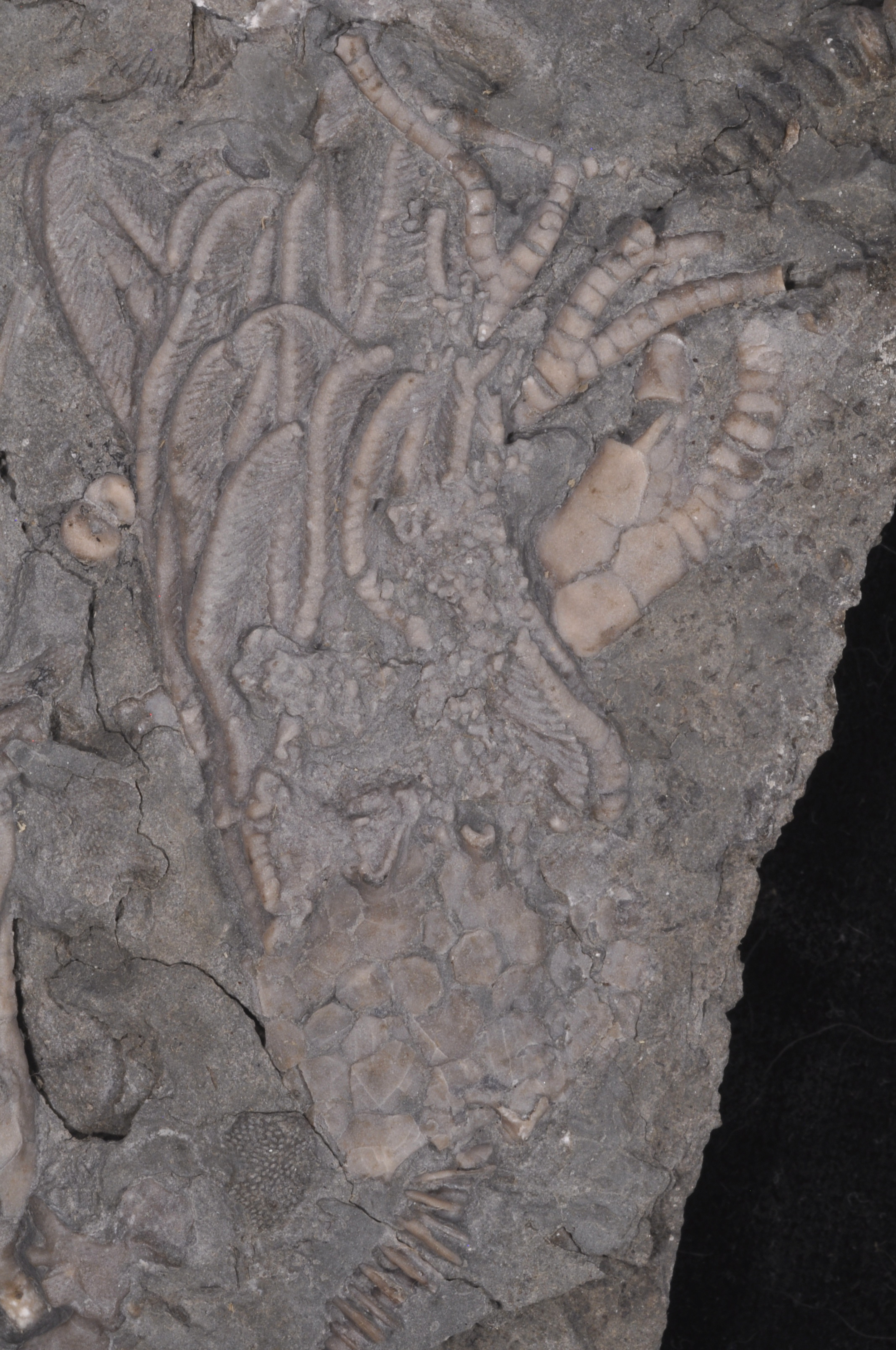 There is a third crown (Cupulocrinus) poking out under the Archaeocrinus. Measurements do not include stem portions. There is a bryozoa lying across the Cupulocrinus arms.